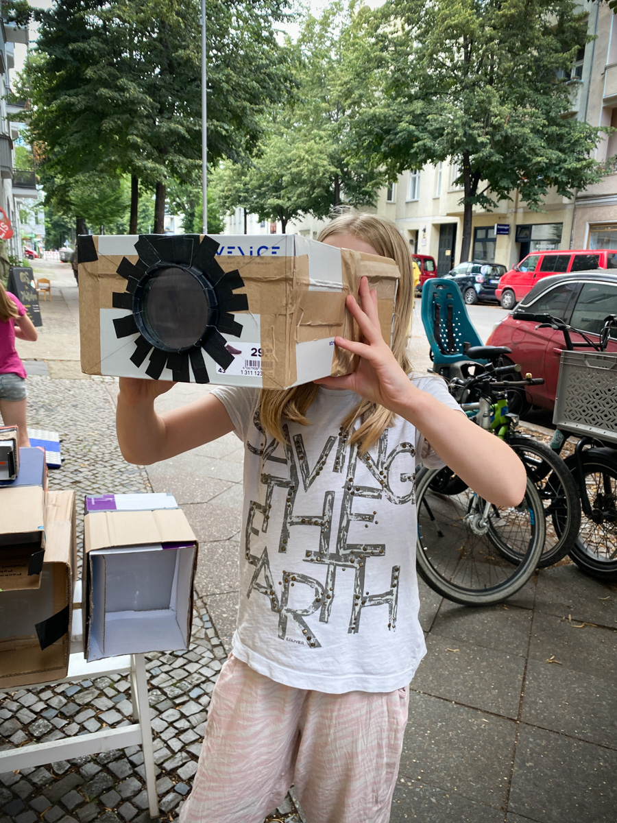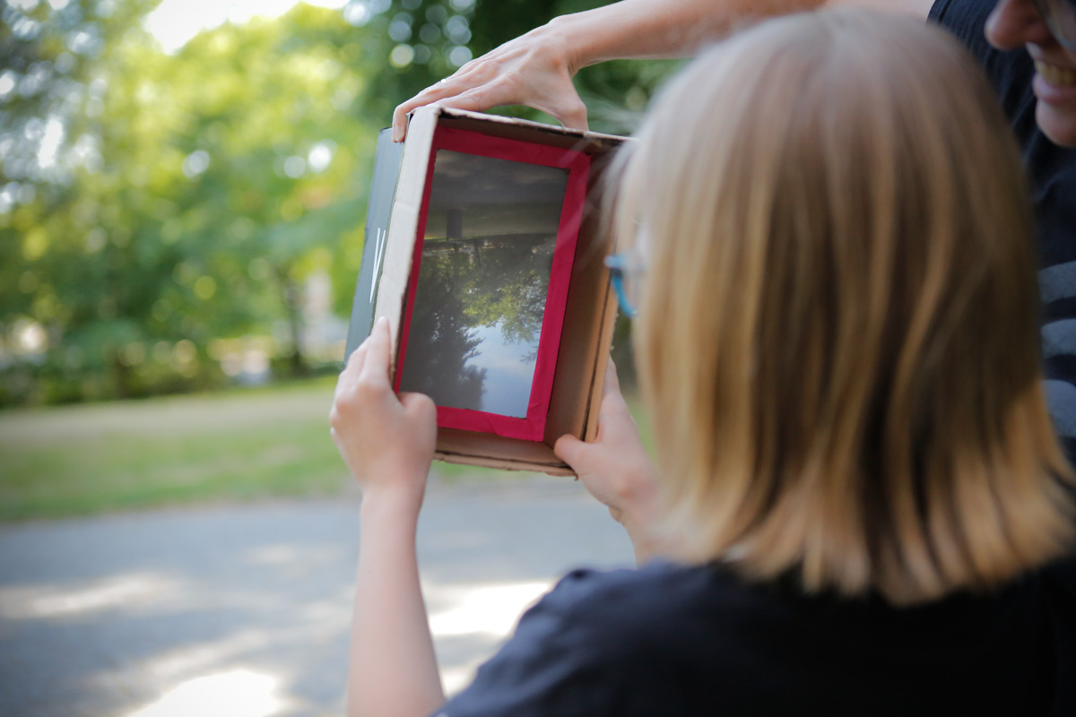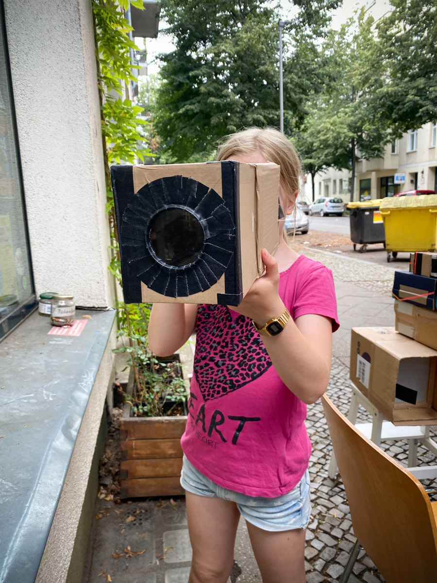 In Projekten mit Schulklassen, Familien und anderen gesellschaftlichen Gruppen bauen wir Camera Obscueas, Loch Kameras und Guck-Kästen, erleben die Welt kopfüber und seitenverkehrt und kreiren unerwartete, einzigartig haptische Bilder unserer Umgebung.