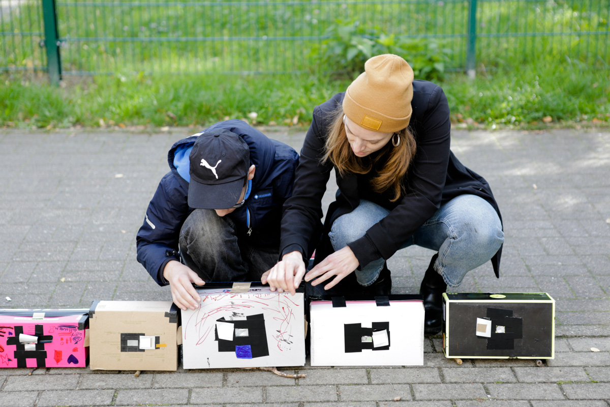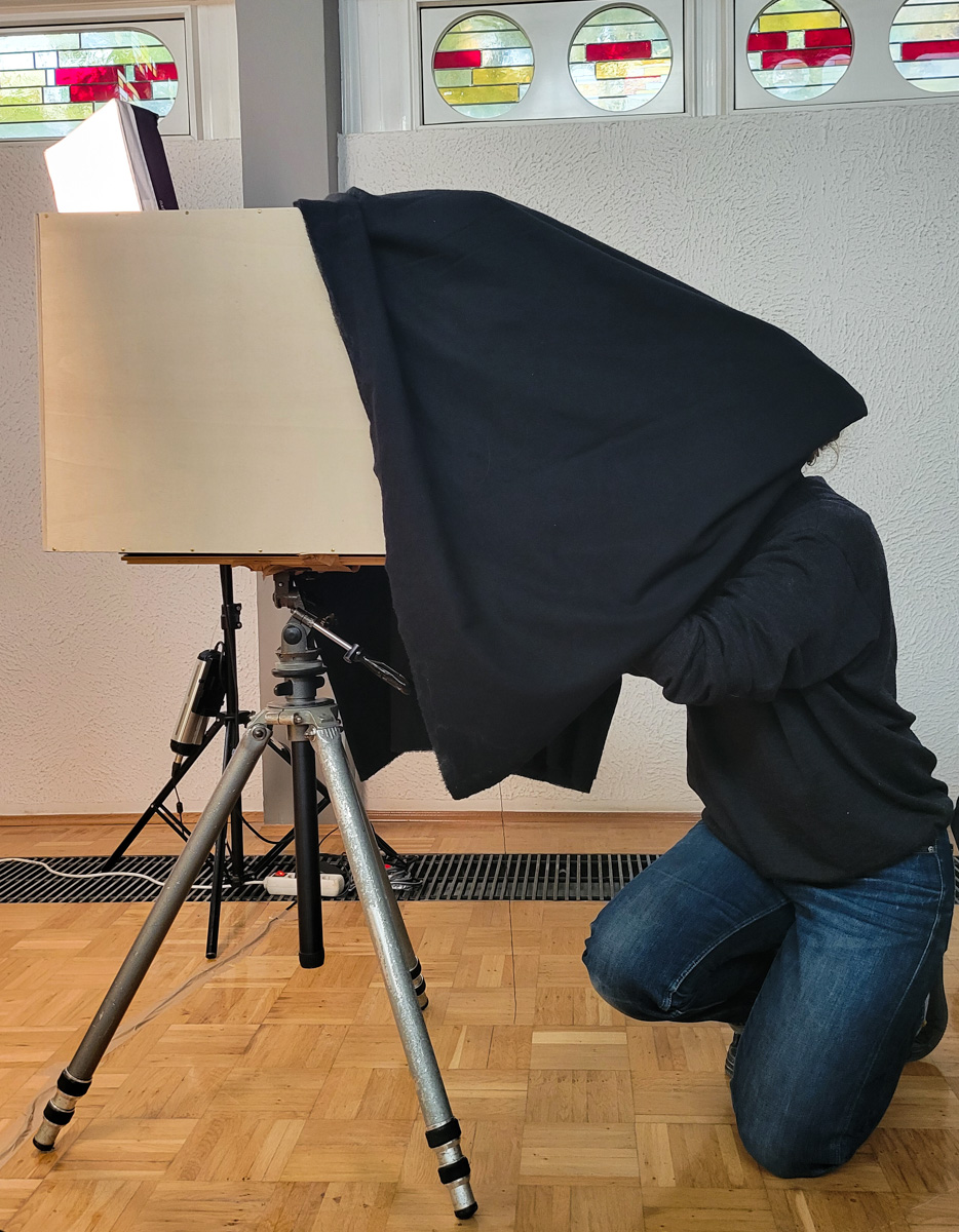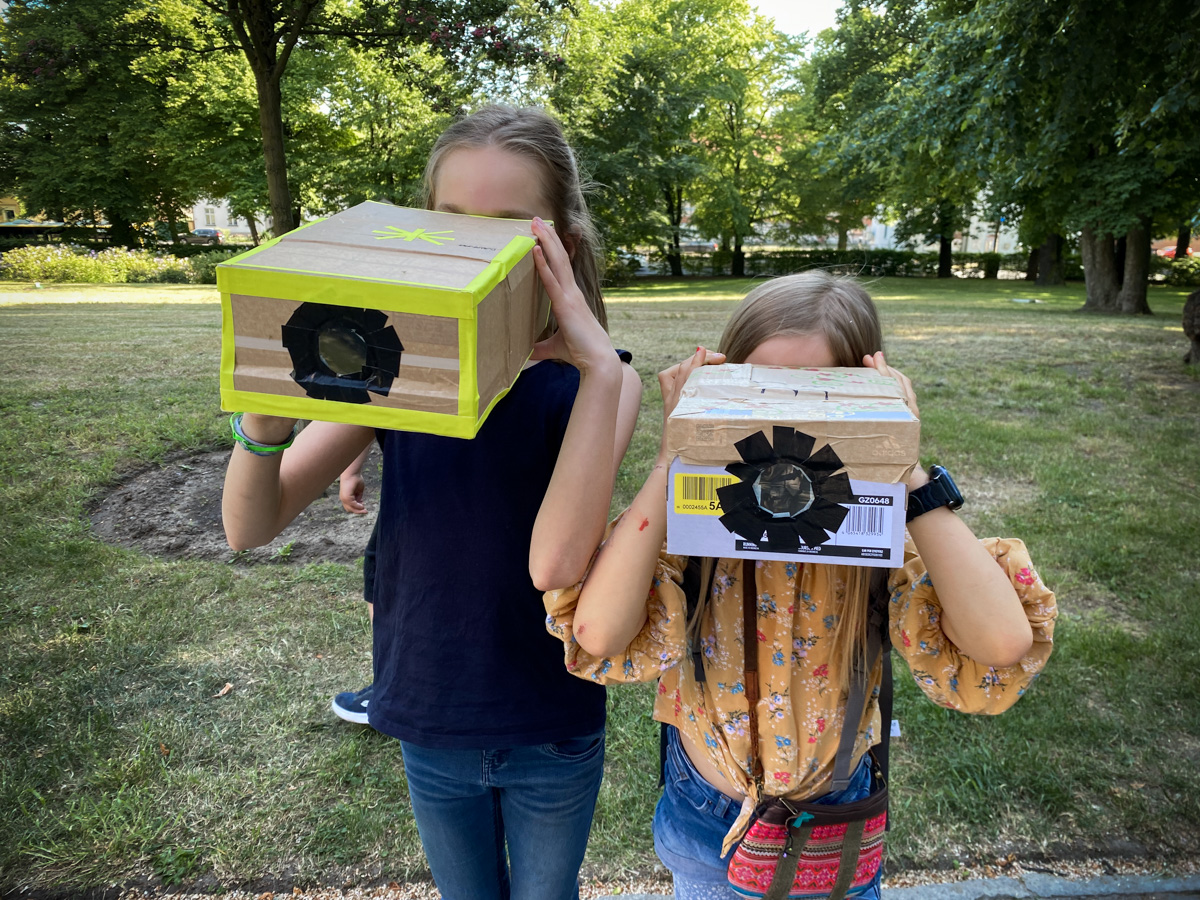 In Projekten mit Schulklassen, Familien und anderen gesellschaftlichen Gruppen bauen wir Camera Obscueas, Loch Kameras und Guck-Kästen, erleben die Welt kopfüber und seitenverkehrt und kreiren unerwartete, einzigartig haptische Bilder unserer Umgebung.